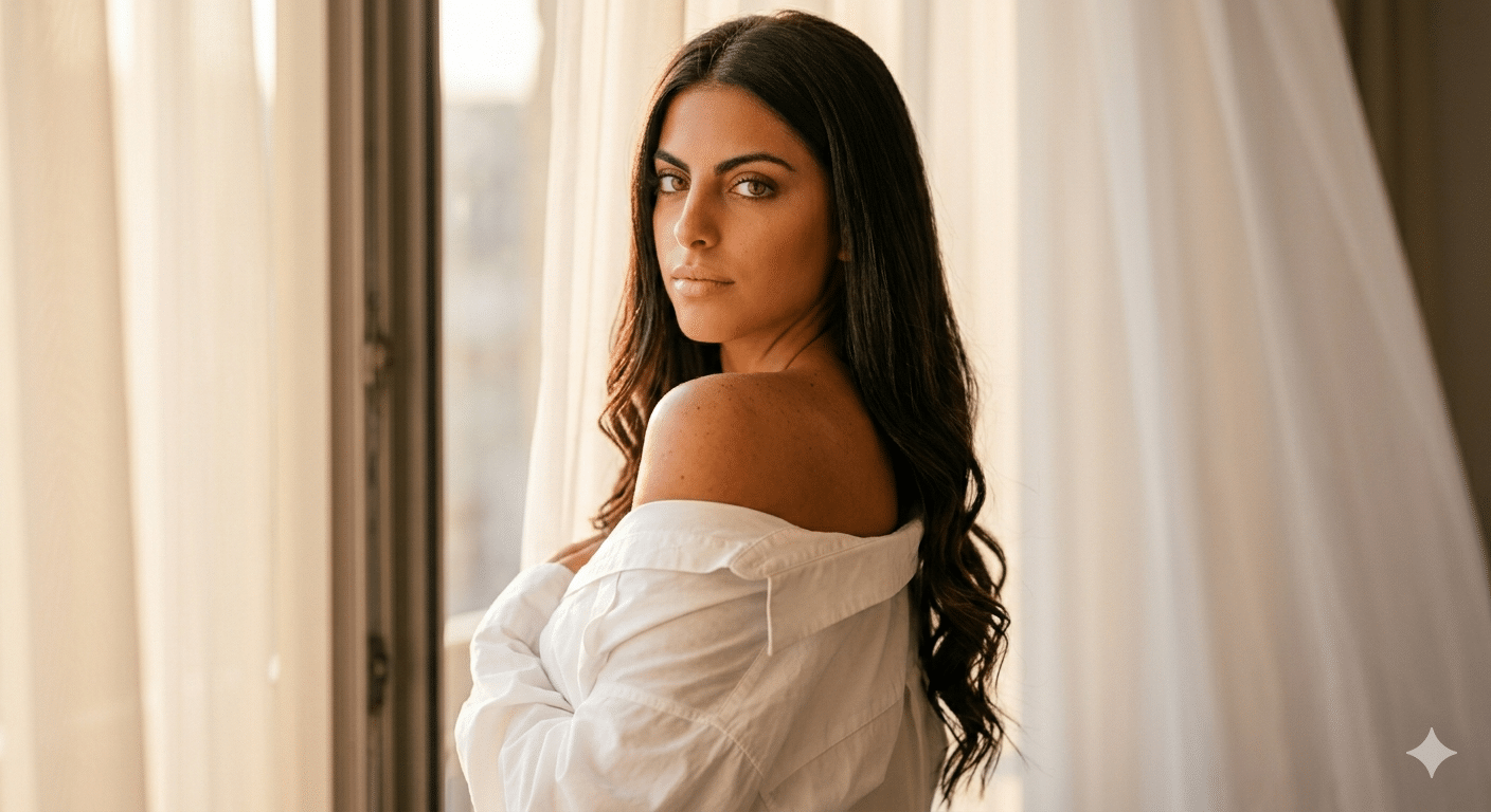 Image générée par IA d'une jeune femme cheveux bouclée devant la fenêtre avec un store
